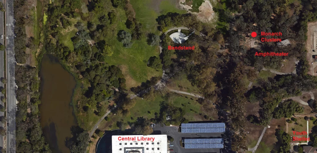 Happy Holidays and fantastic news! The butterfly clusters are behind Central Library. The first tree in front of the old amphitheater. There is a pix of where in these pix. Leslie is so excited that they didn’t leave Huntington Beach!