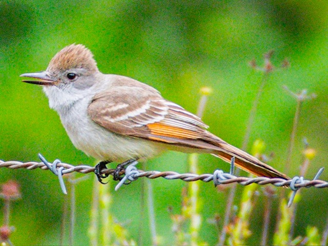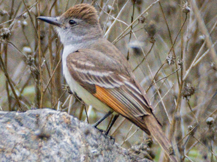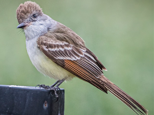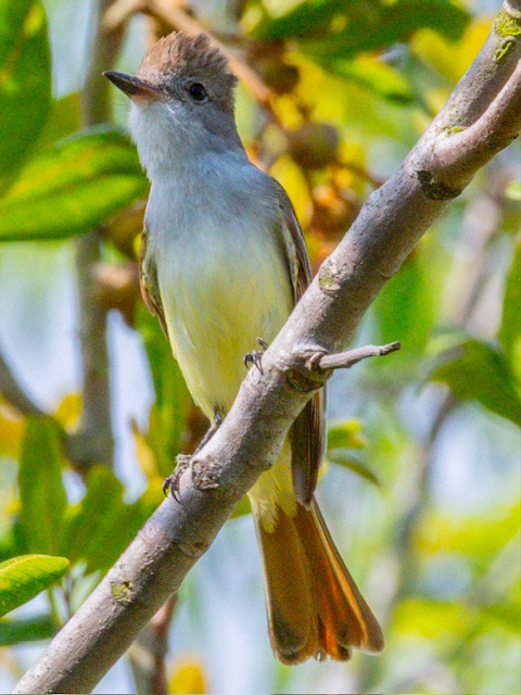 We are alerted to the presence of this tall, lanky flycatcher with a large head topped with a brown bushy crest when it sallies out to snatch a grasshopper from a mid-level tree branch. Its erect stance and dull brown upper-parts are offset by a very pale, ashen throat & breast and a pale, buttery yellow belly. Watch for reddish, rufous tones on its shortish wings and long flashing tail.
