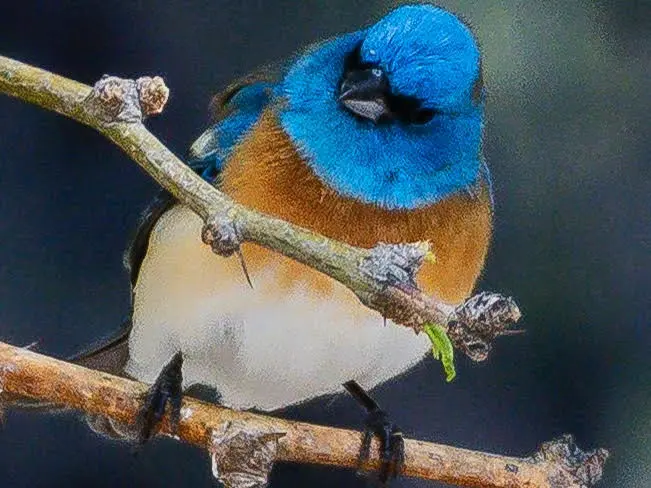 Springtime in the Western States heralds the welcome return of the sky-blue headed Lazuli Bunting and its bubbly springtime song. The Lazuli Bunting is named for a vibrant blue gemstone, lapis lazuli. During its breeding season, a male Lazuli Bunting has bright cerulean-blue head and back, white wing bars, a rusty breast, and white belly. The drabber female is brownish-gray set off by recognizable touches of blue on the wings, tail, and rump. They overwinter along the Pacific coast in Mexico but migrate north in April to search for suitable breeding territories and potential mates in grassy meadows, hillsides and riparian areas.