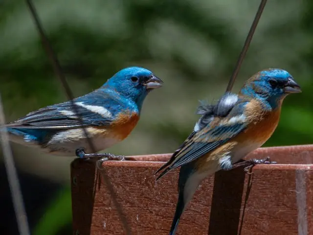 Lazuli Buntings often frequent bird feeders, especially ones that offer millet, sunflower, or nyjer thistle seeds.  You can create bird friendly habitat in your own yard by planting native shrubs to provide foraging and even nesting opportunities for the Lazuli Bunting!