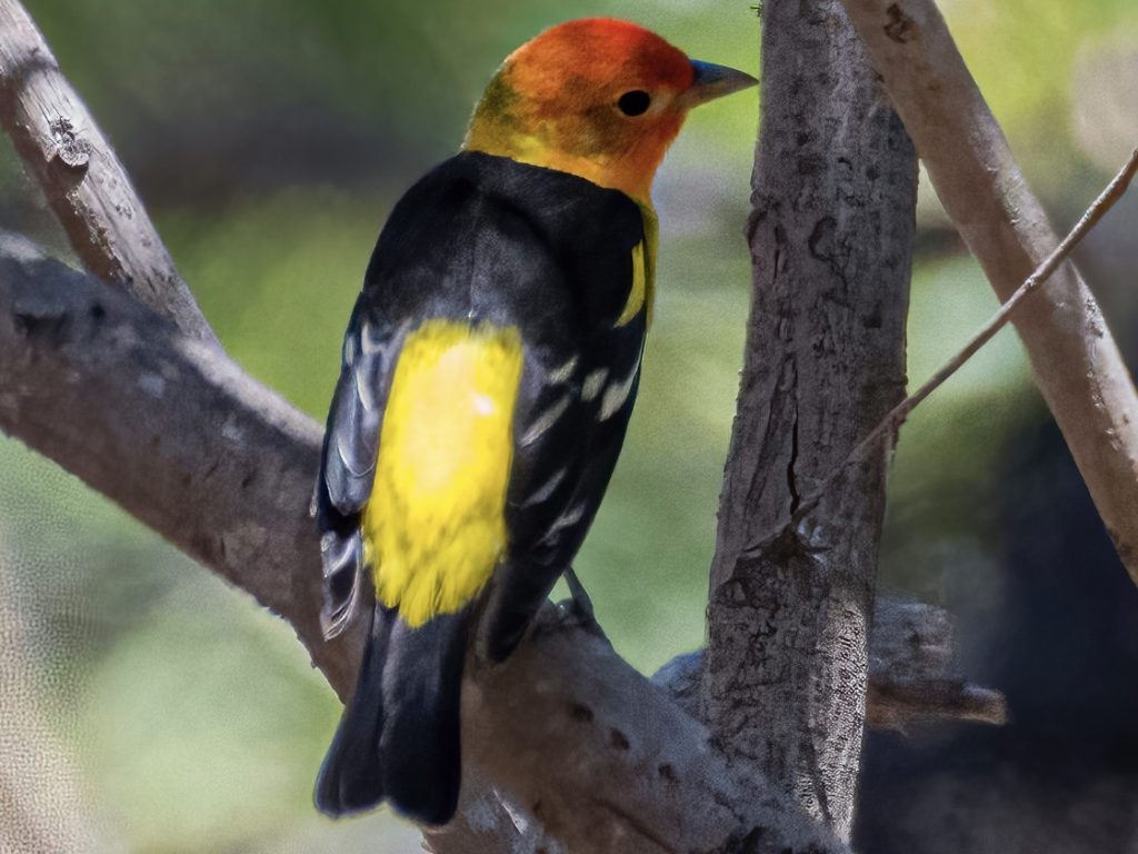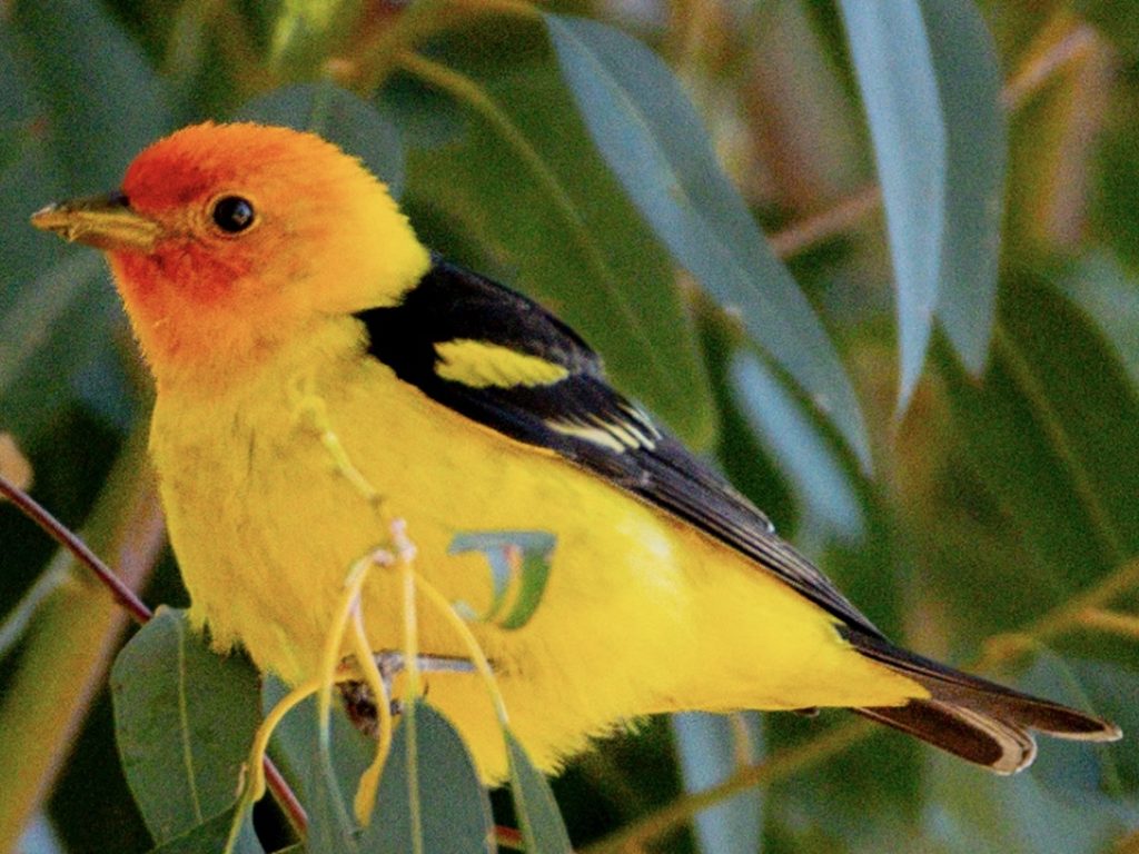Spotting a male Western Tanager as it flits through dense pine trees is both a challenge and a pure delight. The mid-sized songbird presents with a bright yellow body, black wings and an astonishing red head. The drabber female is duller, greenish yellow below with grayish back and wings.